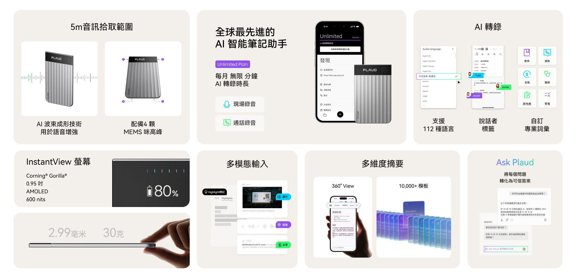 透過 AI 波束成形技術,Plaud Note Pro 可在 5 m 範圍內捕捉清晰的人聲,確保每個字都被完整保存。